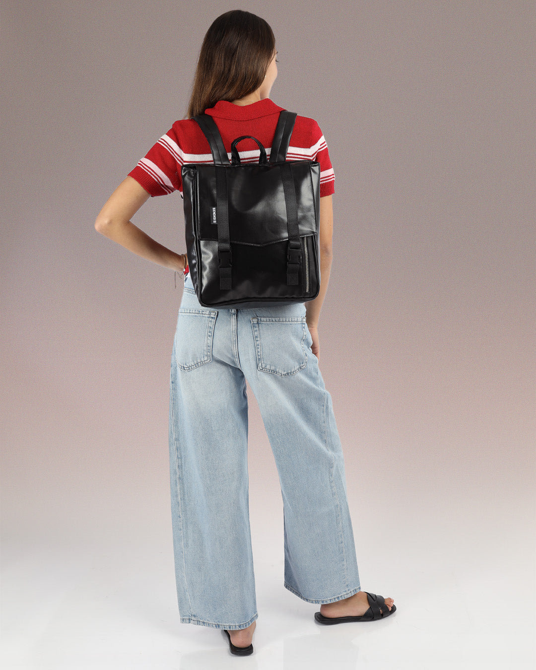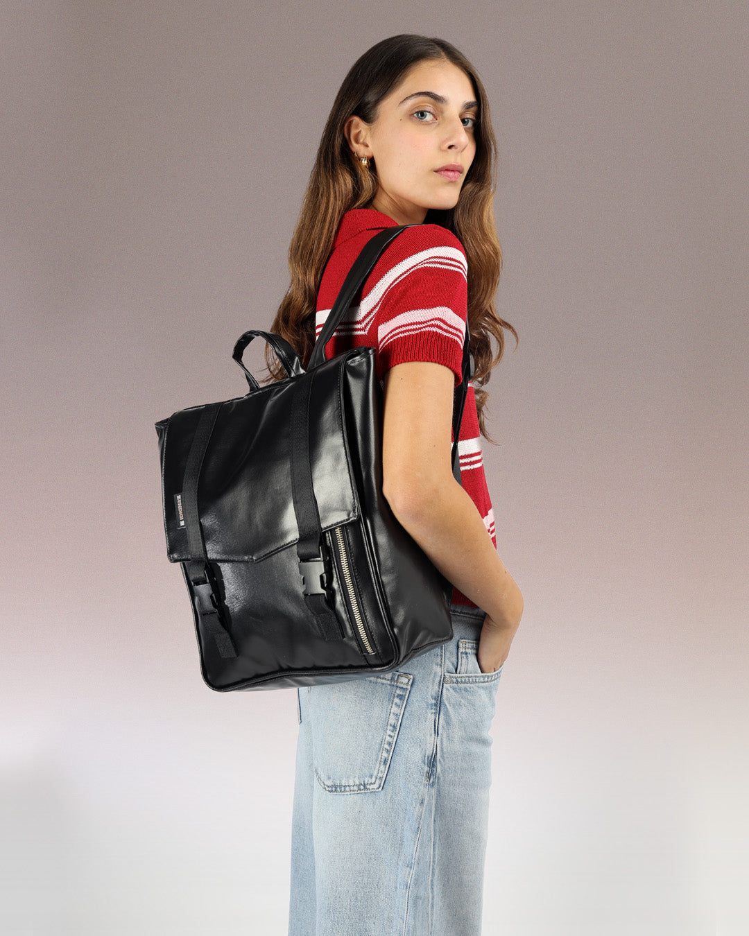 מיני טוקיו שחור מבריק מוצג על דוגמנית, תיק הגב המושלם למחשב, משלב באופן אולטימטיבי בין נוחות ליופי, ניתן לראות את גודל התיק ביחס לגופה של הדוגמנית
