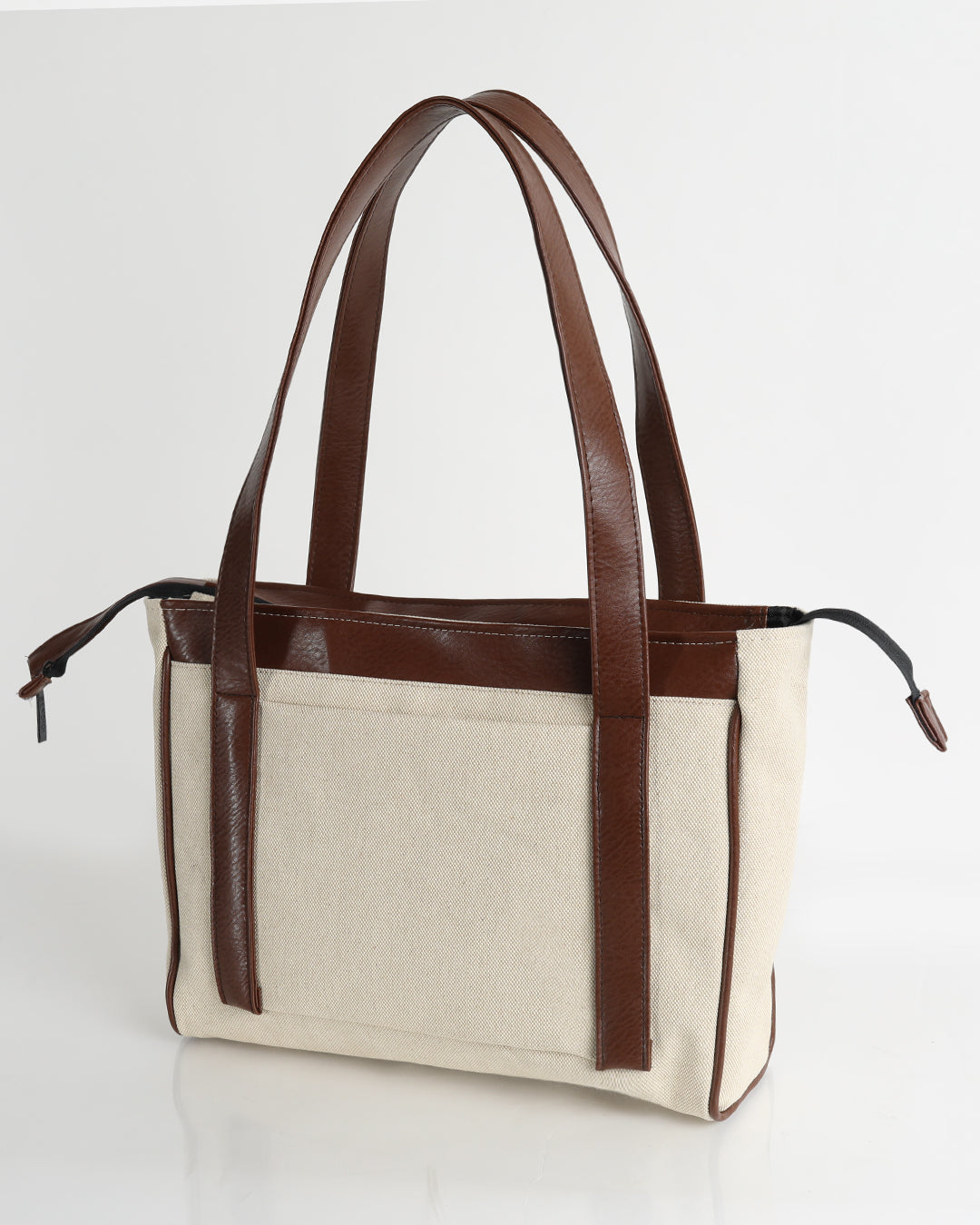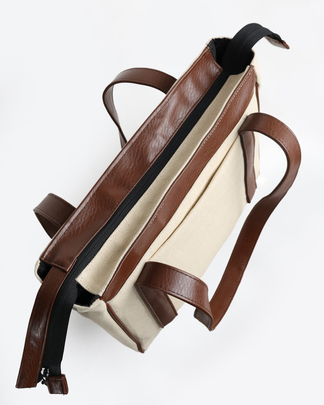 תיק צד מיני פלא בז׳ קנבס וחום כהה  - תיק אופנתי ליום יום, עבודה ולימודים. מתאים למחשב נייד עד 14 אינץ', שילוב מושלם של סטייל ופרקטיות.