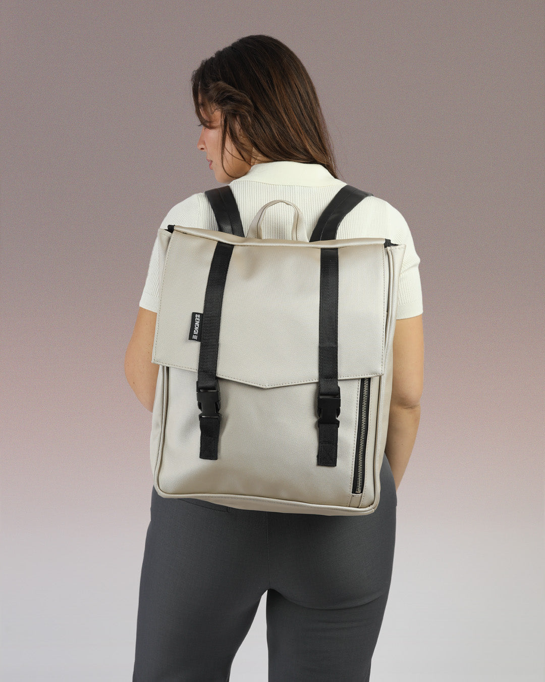 דוגמנית עם תיק גב טוקיו בכסף שיבולים מבית זנדיגי - תיק גב טבעוני למחשב נייד בעיצוב מינימליסטי ונקי, מושלם לסטודנטים ולהייטקיסטים.