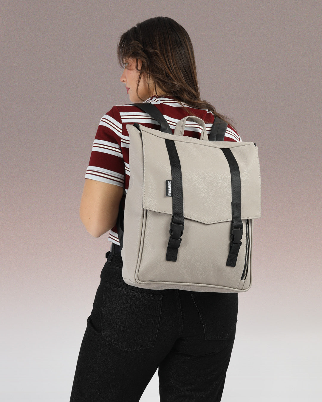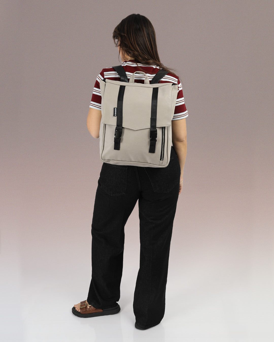 תיק גב טוקיו בצבע אבן זמש על גב של דוגמנית, תיק טבעוני עם עיצוב פרקטי ומוקפד, מתאים לגבר ולאישה.
