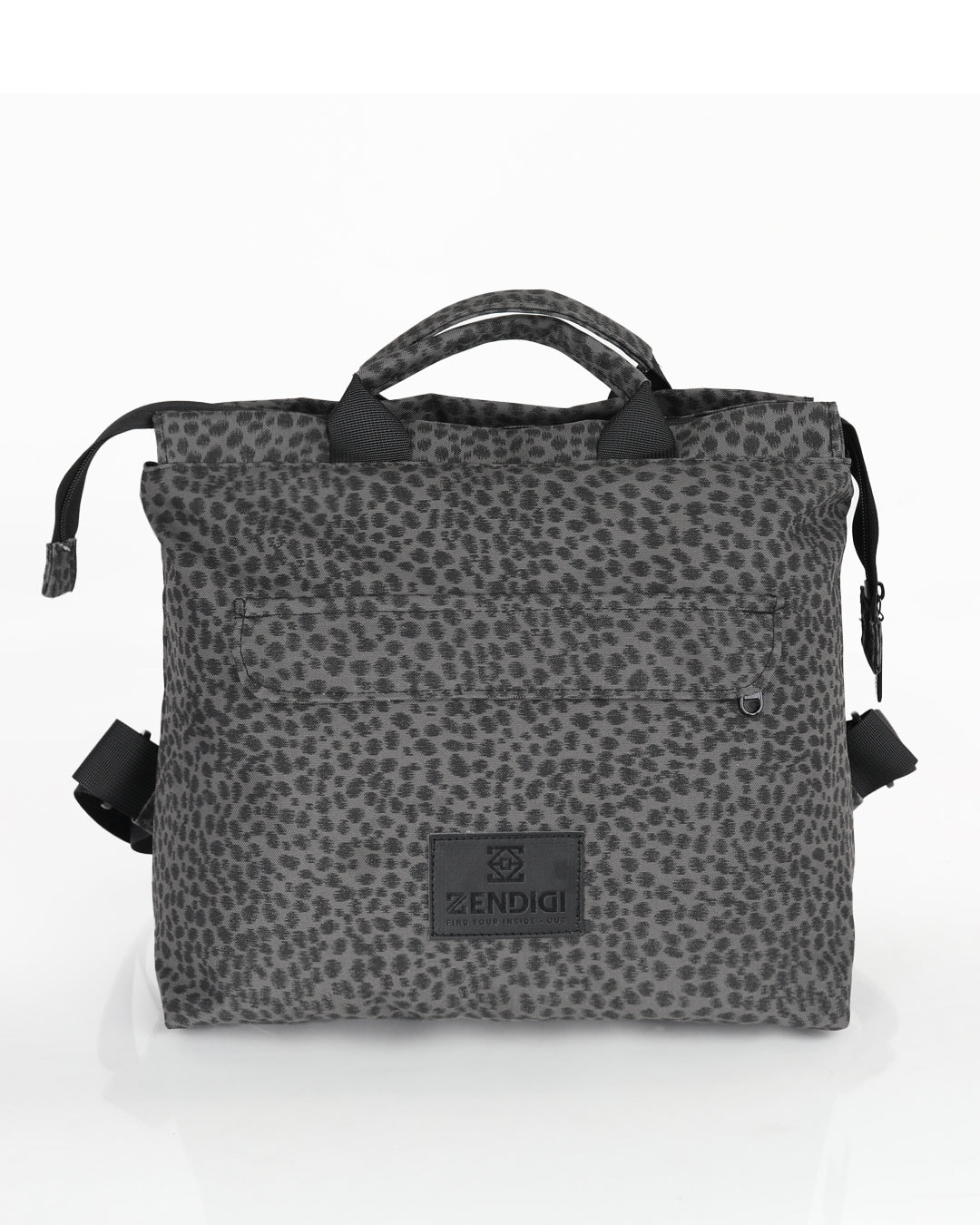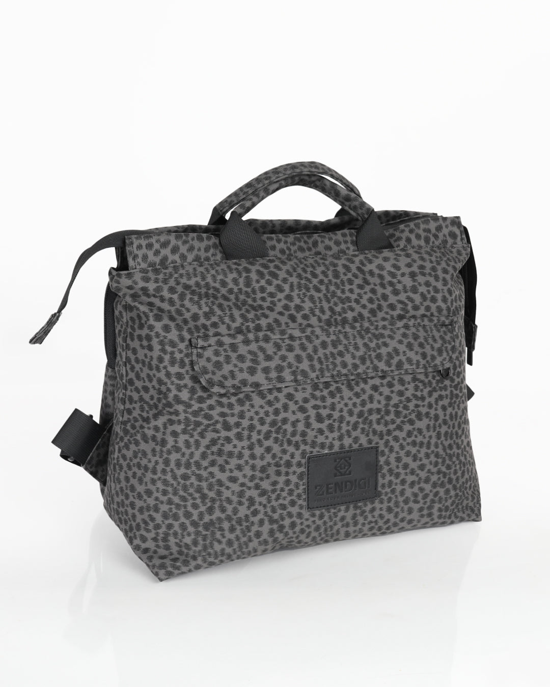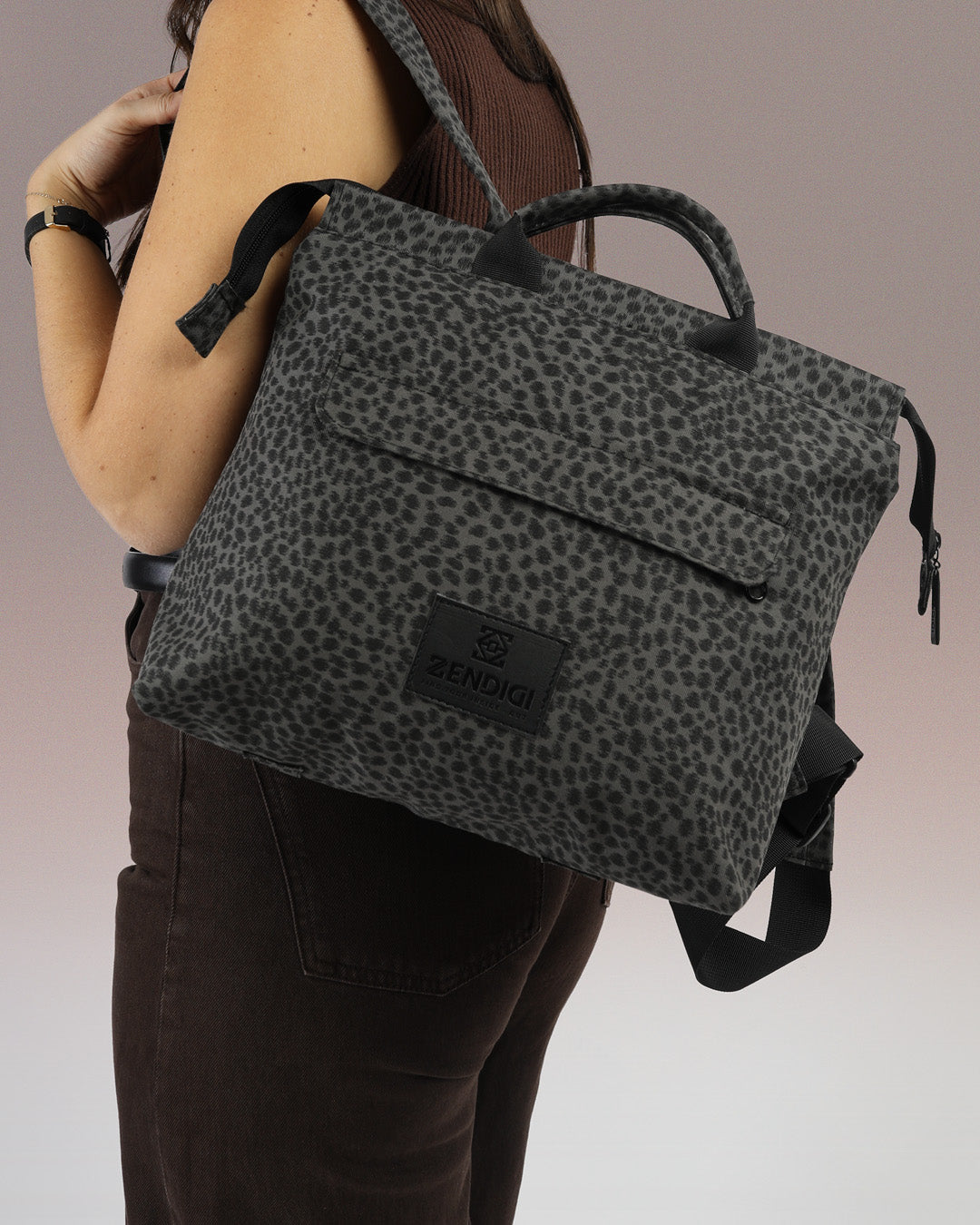 תיק גב מדריד אפור מנומר תיק טבעוני בעיצוב ריבועי של זנדיגי - מתאים לנשים ולגברים, כולל תא קדמי מוסתר ורוכסן עליון מוצג מהפרונט