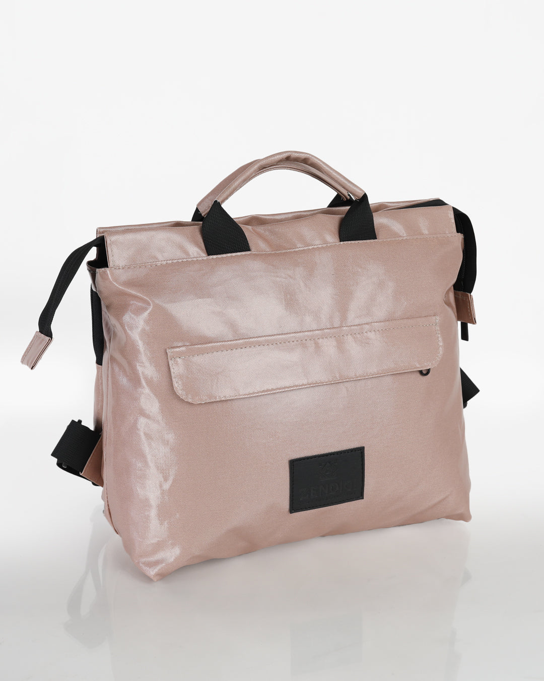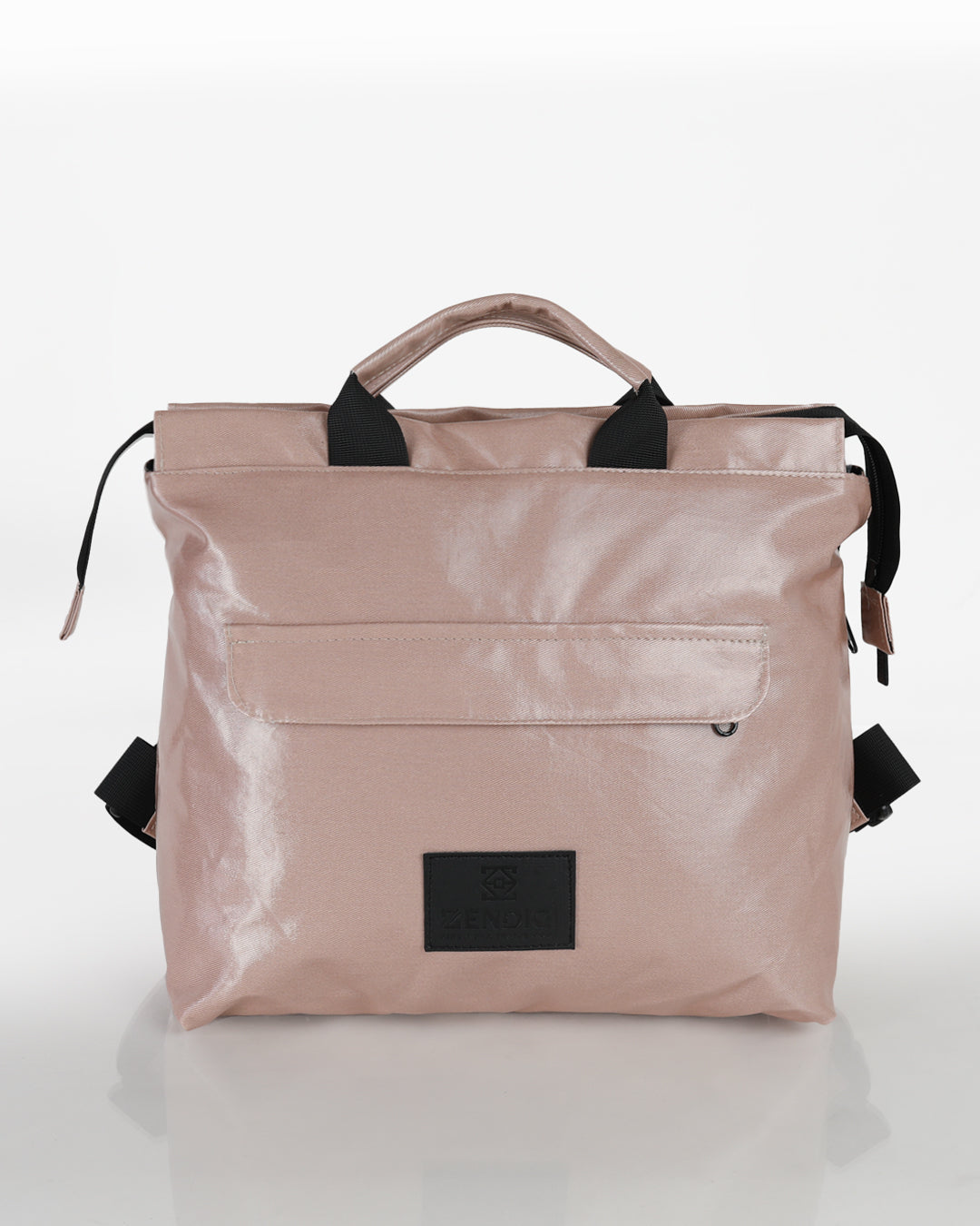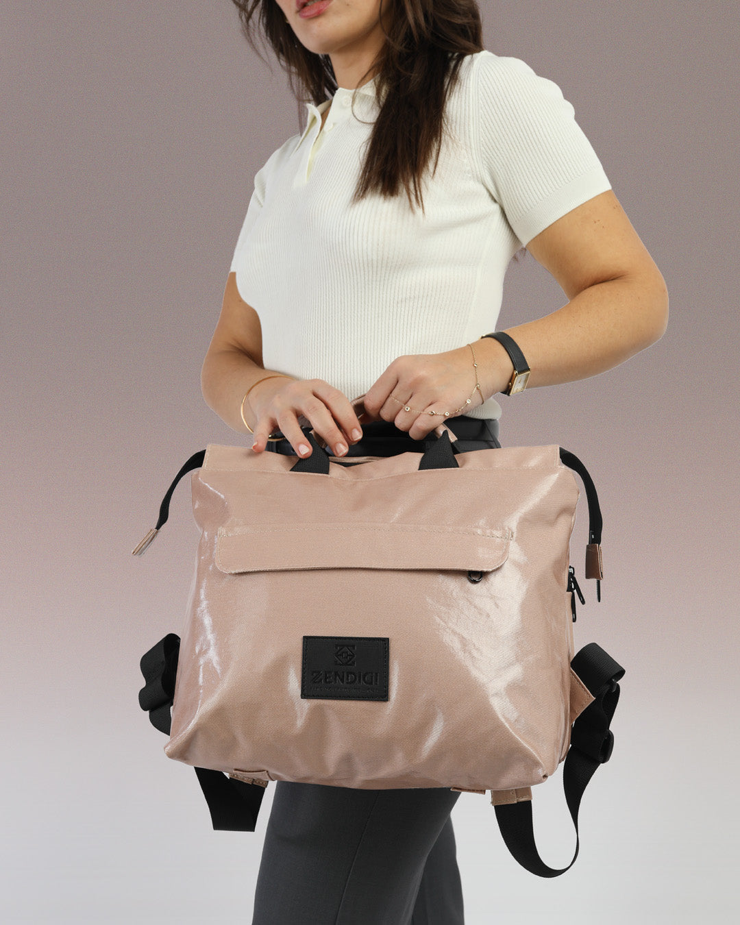 תיק גב מדריד ורוד מבריק תיק טבעוני בעיצוב ריבועי של זנדיגי - מתאים לנשים ולגברים, כולל תא קדמי מוסתר ורוכסן עליון מוצג מהפרונט