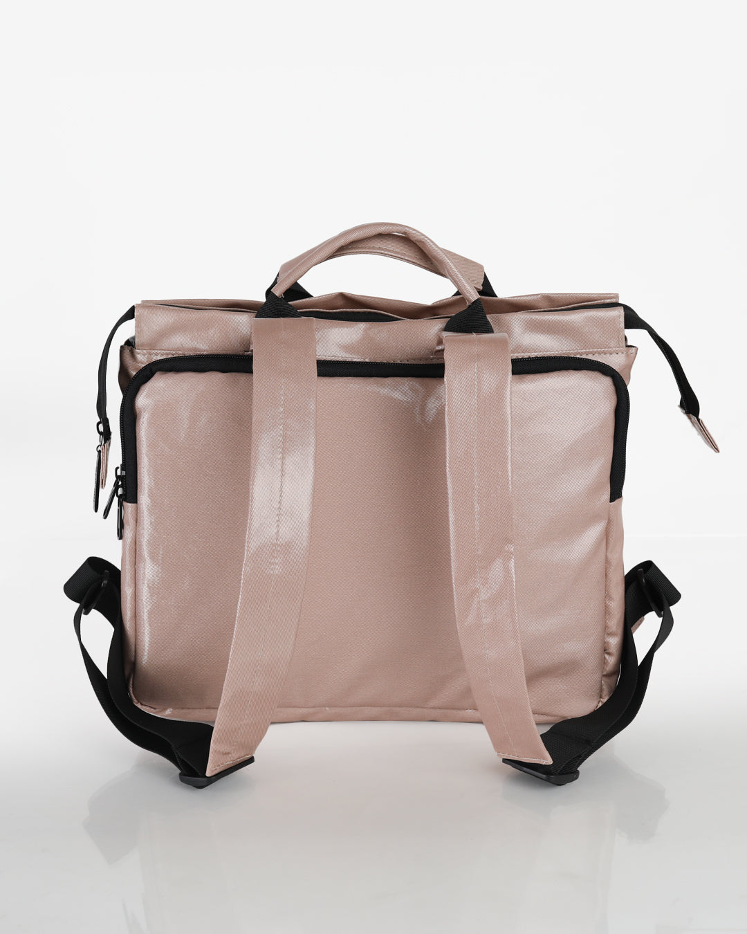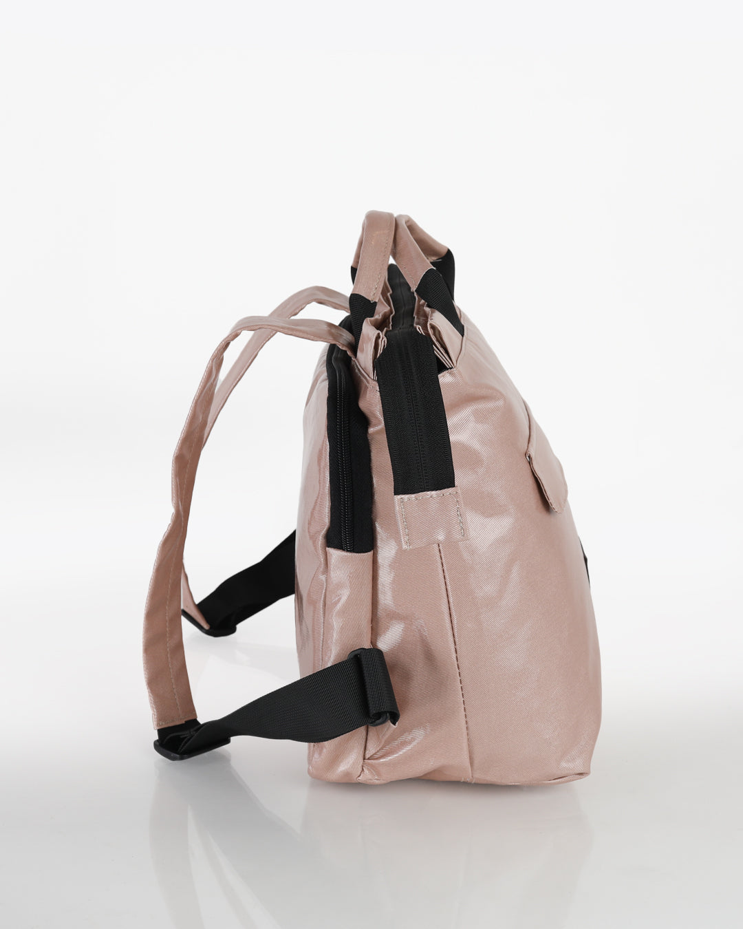 תיק גב מדריד ורוד מבריק מן הצד, תיק גב למחשב נייד 14״, ניתן לראות את כיסוי המחשב המרופד המחובר לגב, רצועות נוחות ועבות, תיק גב טבעוני לגבר ולאישה.