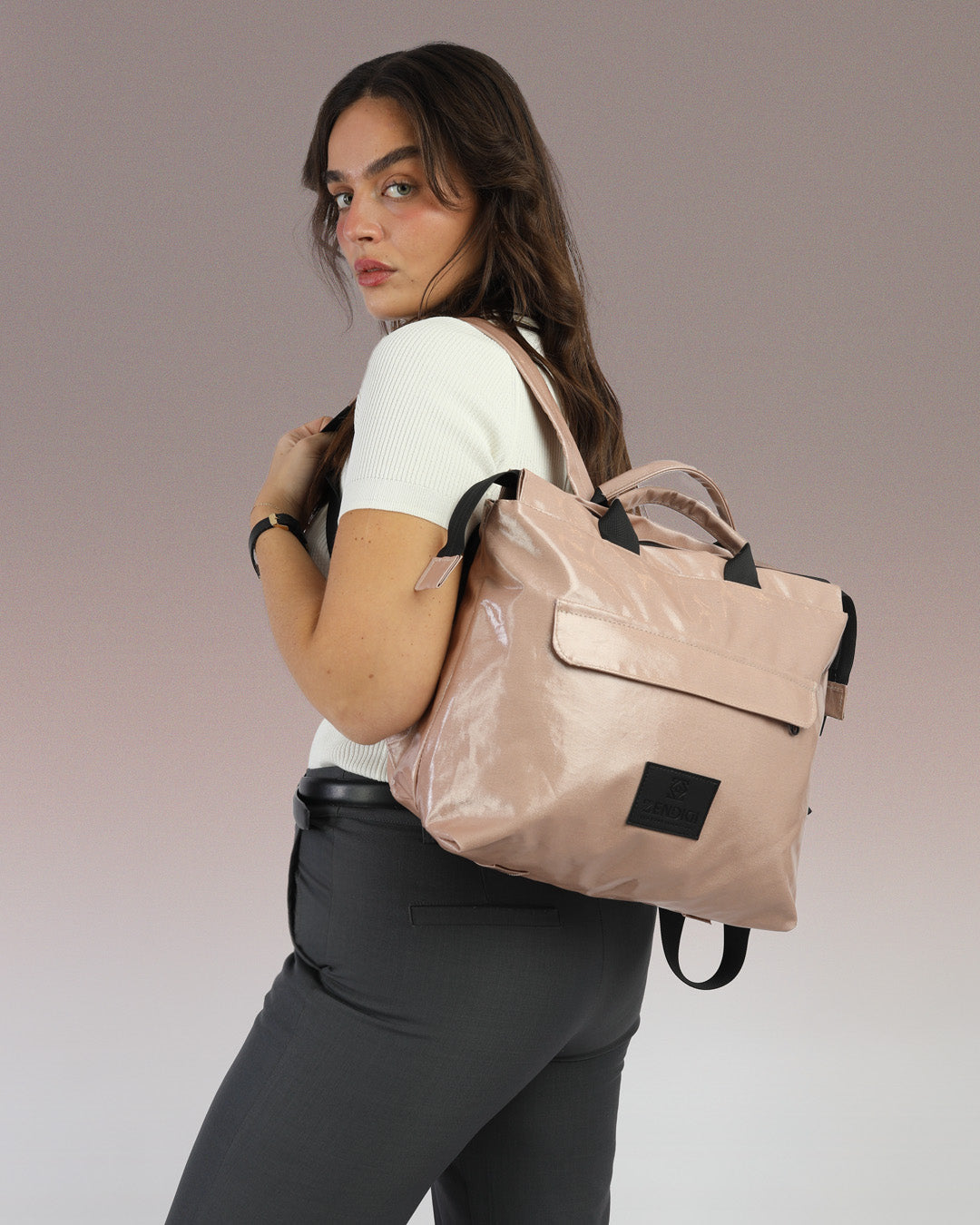 תיק גב למחשב נייד מדריד, תיק טבעוני לנשים ולגברים בצבע ורוד מבריק, עיצוב ישראלי נקי, תיק למשרד או ללימודים, נוח יומיומי ומתאים לסטודנטים
