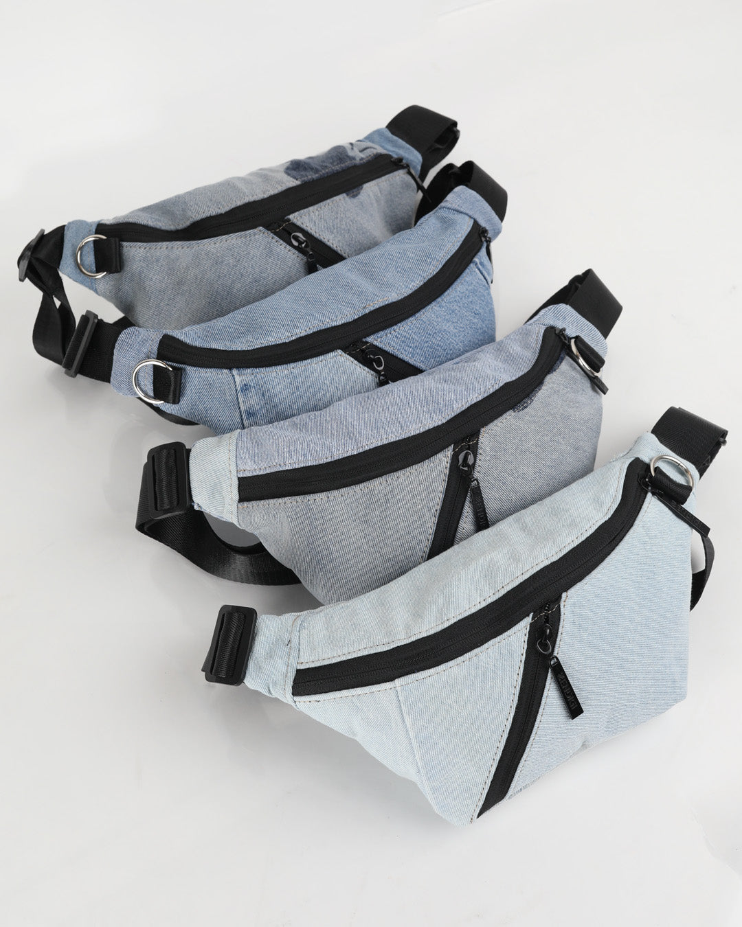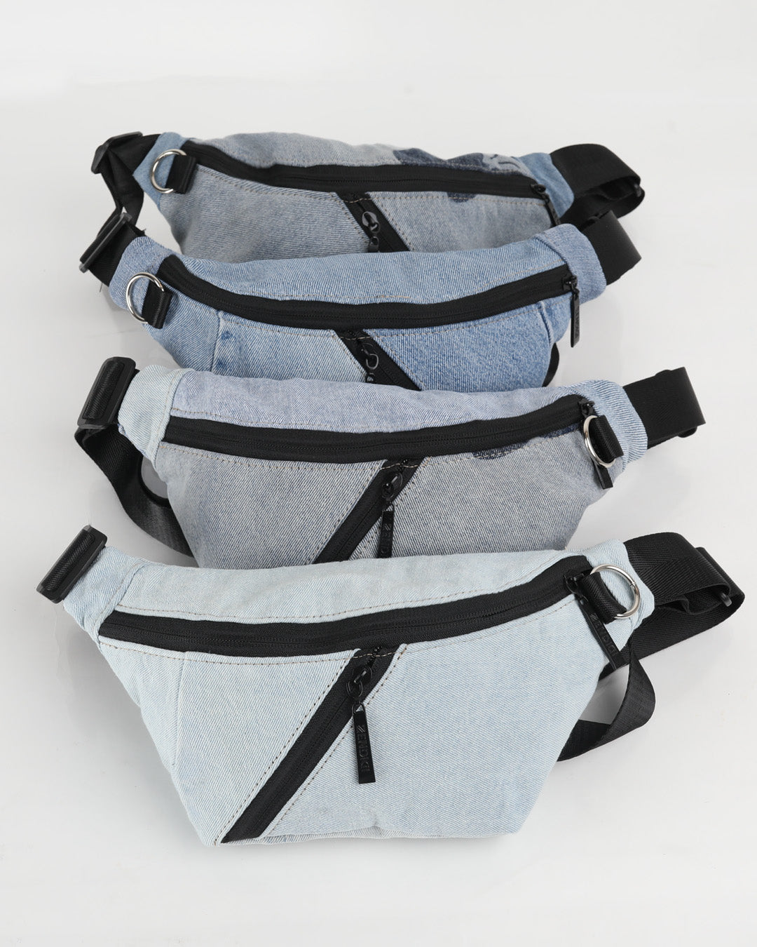 מבחר של פאוצ׳ים מבד ג׳ינס, כל אחד שונה אבל כולם בצבע כחול בהיר.