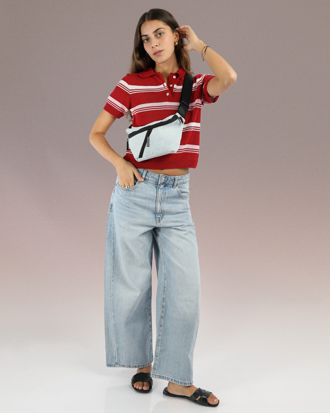 פאוץ׳ רובר ג׳ינס, פאוץ׳ ממוחדש מבד ג׳ינס אמיתי, חלוקה חכמה ומרווחת, מוצג על דוגמנית.
