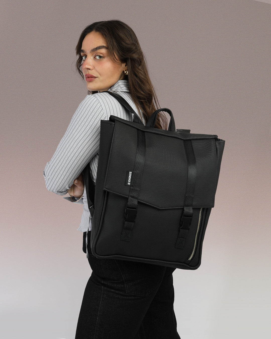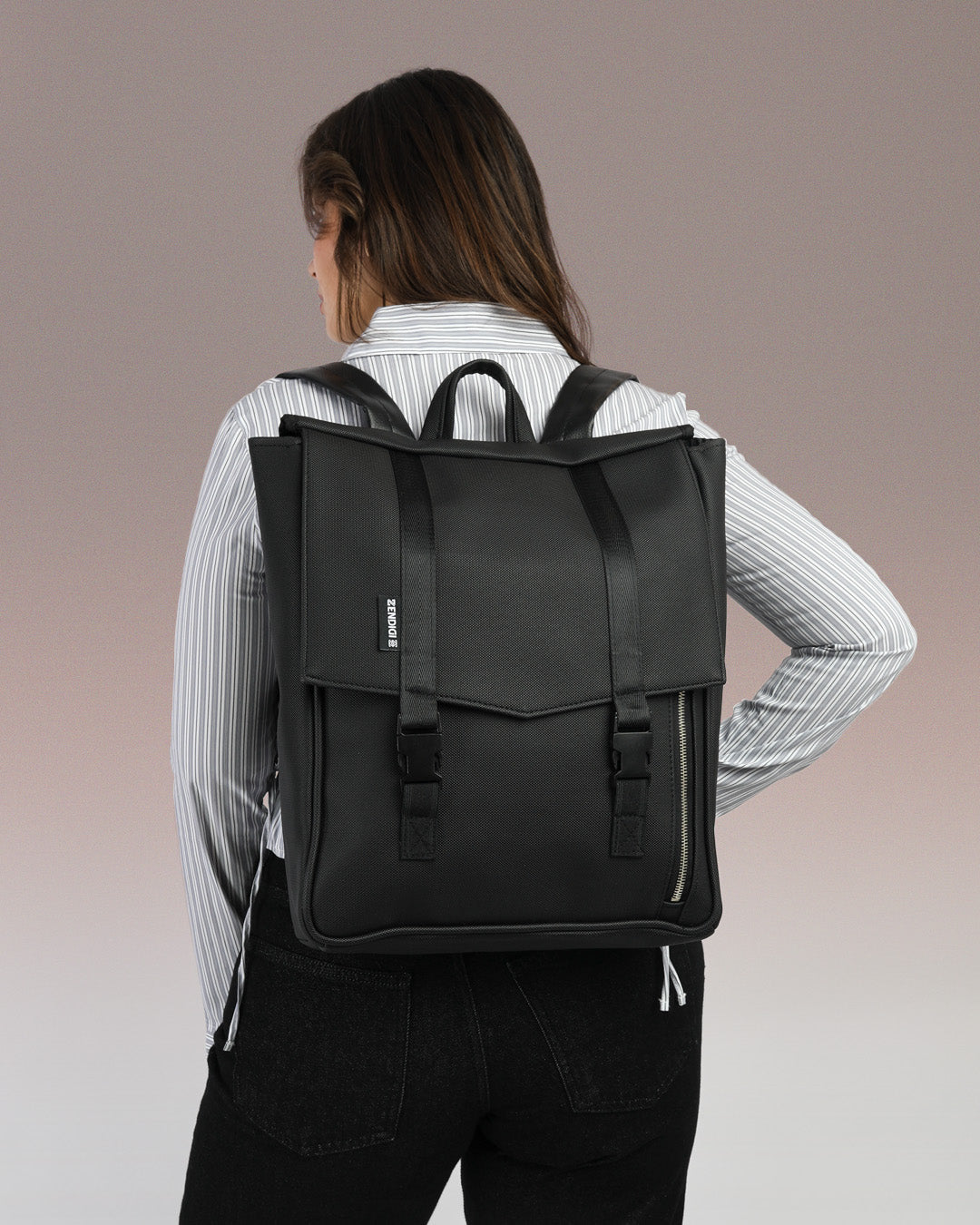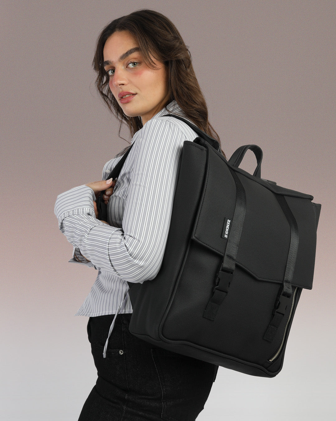 דוגמנית עם תיק גב טוקיו שחור יהלום מבית זנדיגי - תיק גב טבעוני למחשב נייד בעיצוב מינימליסטי ונקי, מושלם לסטודנטים ולהייטקיסטים.