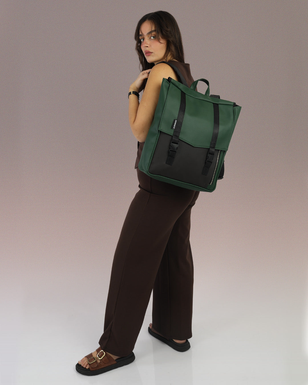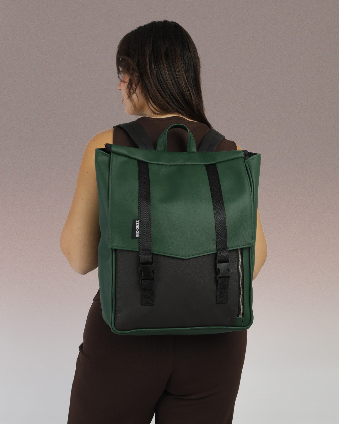 דוגמנית עם תיק גב טוקיו ירוק ושחור מבית זנדיגי - תיק גב טבעוני למחשב נייד בעיצוב מינימליסטי ונקי, מושלם לסטודנטים ולהייטקיסטים.