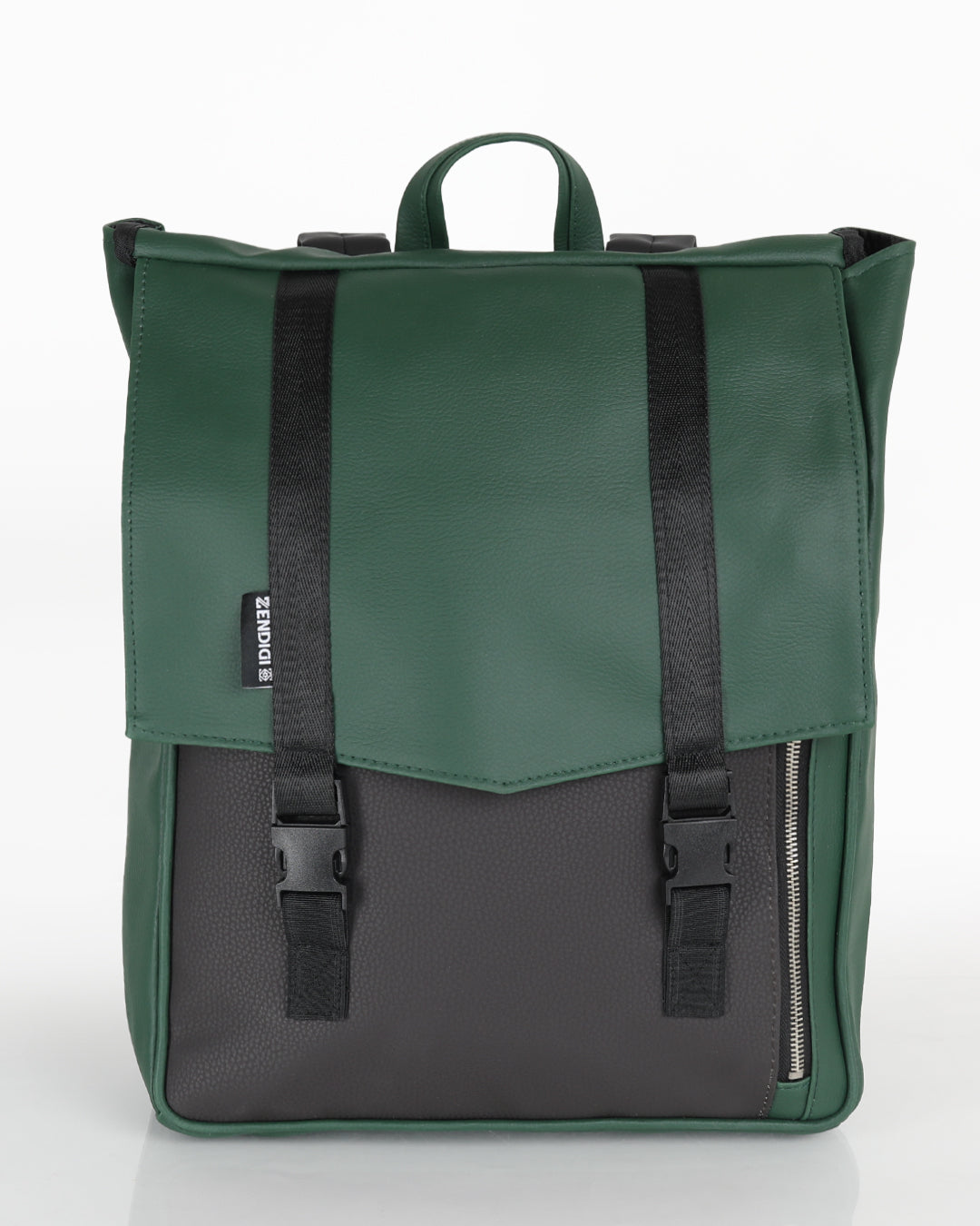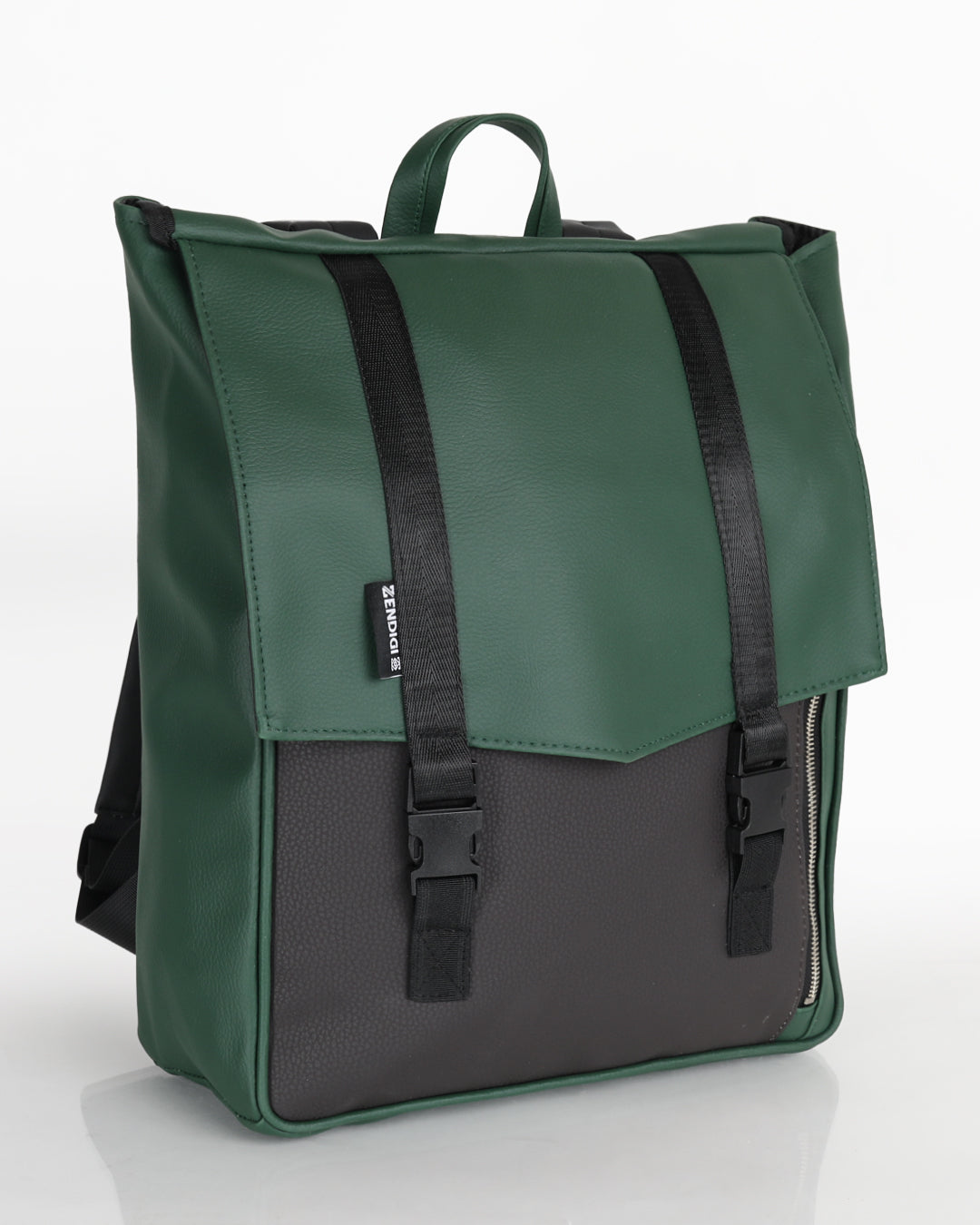 תיק גב טבעוני טוקיו ירוק כהה ושחור מבית ZENDIGI - עיצוב נקי וחכם עם רוכסן צדדי נגיש, תא למחשב נייד ותאים פנימיים מאורגנים. מושלם לסטודנטים, לעבודה או לנסיעות.
